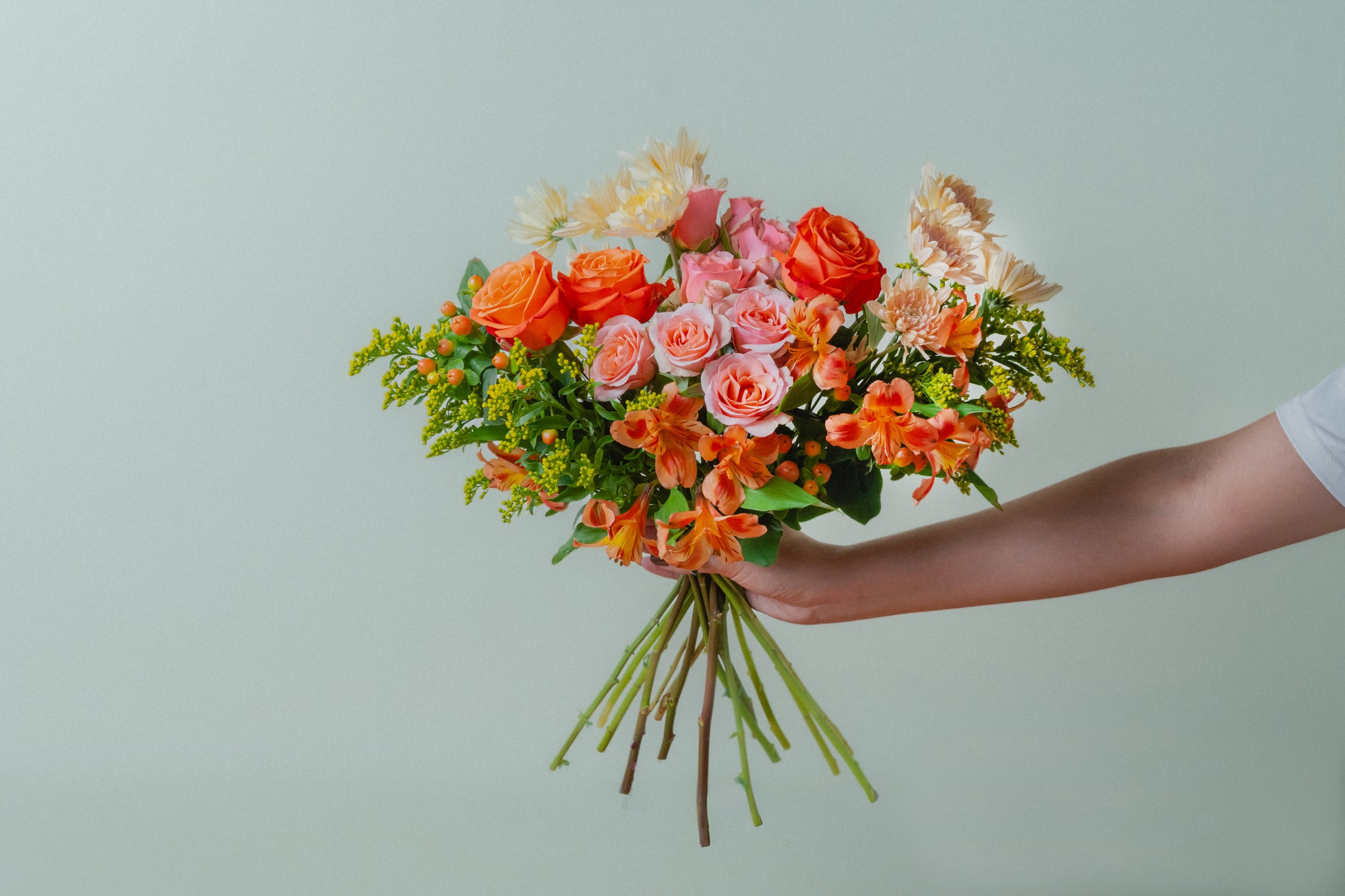 A sun-soaked blend of coral, apricot, and mango-toned blooms, gathered with fresh greenery for a lively, radiant look. Bold, playful, and full of warmth—Mango Muse brings instant energy and joy.