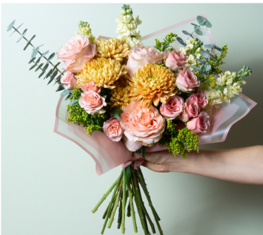 A radiant blend of soft peach, buttery yellow, and warm blush blooms, wrapped with light greenery for a luminous, garden-fresh feel. Uplifting, generous, and full of warmth.