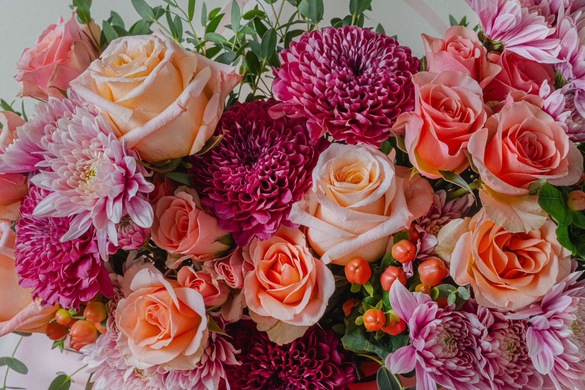 A warm composition of peach, blush, and deep berry tones, woven together with textured blooms and soft greenery. Rich, inviting, and beautifully balanced.